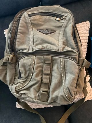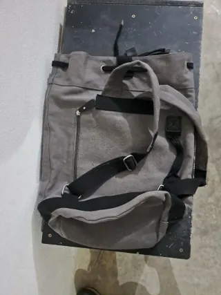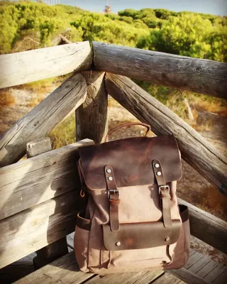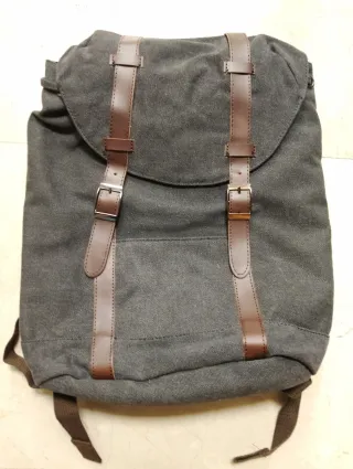 Mochila de estilo vintage, ideal para senderismo o uso diario. Su diseño combina funcionalidad y un toque retro. - Material resistente de lona. - Múltiples compartimentos para organización. - Asas y detalles en cuero. - Cierre con cremalleras y broches.