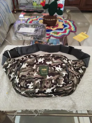 Riñonera con estampado de camuflaje y acabado plastificado. - Diseño moderno y práctico. - Correa ajustable para mayor comodidad. - Cremalleras para acceso a los compartimentos. Producto nuevo a estrenar. Riñonera de camuflaje lona plastificada, forrada por dentro con cremallera metalica y tres compartimentos tamaño grande. Atendemos los 7 dias de la semana. Y hacemos envios por Wallapop. Kalobi