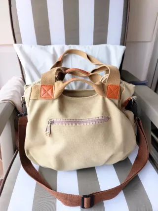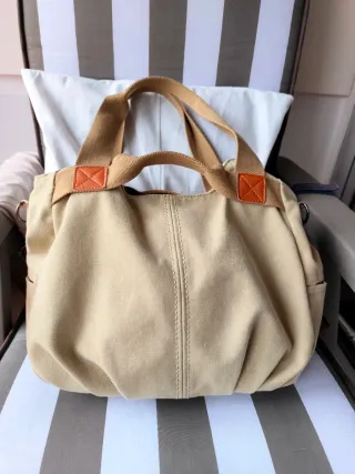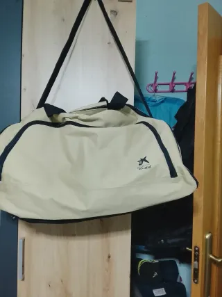 Práctica bolsa de viaje en color beige, ideal para escapadas o el gimnasio. Cuenta con asas resistentes y una correa ajustable para mayor comodidad. 60 cm de largo 38 de ancho y 20 fondo. Poco uso, prácticamente nueva - Compartimento principal espacioso. - Bolsillo frontal con cremallera. - Cierre de cremallera en el compartimento principal. Descuento del 10% en dos o más artículos de mis anuncios y 25% a partir de 5