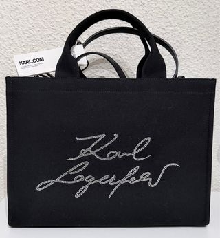 Elegante bolso de lona con detalles de pedrería. - Diseño con el nombre de la marca Karl Lagerfeld bordado con pedrería. - Asas de mano y correa. - Cierre superior.