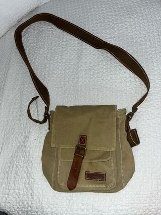 Bolso de lona estilo vintage en color caqui. Un accesorio práctico y con un diseño clásico. - Cierre principal con solapa y broche. - Bolsillo frontal con cremallera. - Dos bolsillos laterales con cremallera. - Correa ajustable para llevar al hombro o cruzado. - Detalle de etiqueta de cuero con logo.