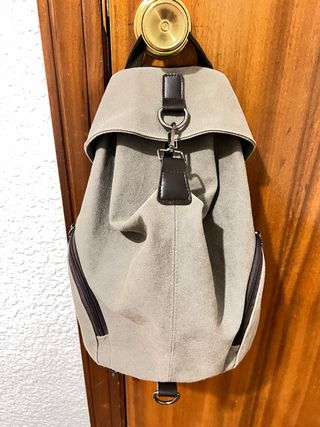 Mochila con un diseño moderno y práctico, combinando dos tonos elegantes. - Solapa superior de cuero. - Cierre con correas de cuero y hebillas. - Bolsillo frontal. - Asa superior. - Correa para colgar.