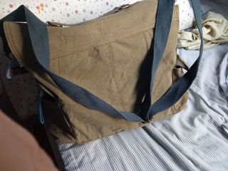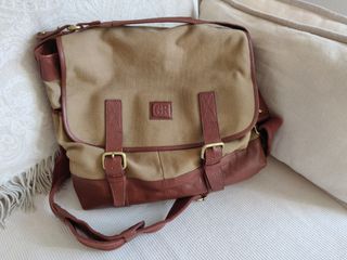 Bandolera de lona con un diseño práctico y moderno. - Cierre principal con solapa. - Bolsillo frontal con cremallera. - Correa ajustable, para llevar como bandolera. - Asa corta arriba -Bolsillo principal grande+ bolsillo interior trasero + bolsillo interior delantero + soporte para boligrafos. - 2 Bolsillos laterales para botella. - Bolsillo delantero con cremallera -Medidas 45 x 35 x 10 -Marca Item international. -Como nueva.