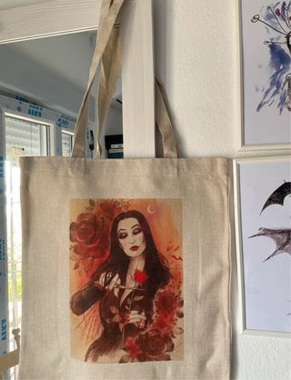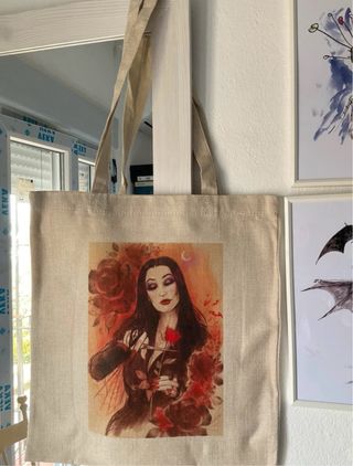 Bolso de tela tipo lona con un diseño inspirado en Morticia Addams y rosas rojas. - Estampado impreso detallado de Morticia Addams. - Motivo floral con rosas. - Material de lona resistente.