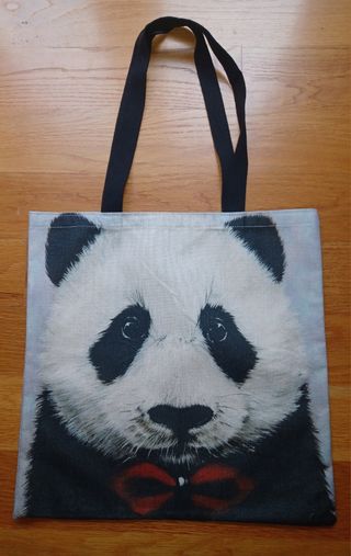 Bolso de lona con la foto de un oso panda en ambas caras y un lazo rojo a estrenar. Tamaño (38×39)cm y desde las asas 64cm.Se puede enseñar sin ningún compromiso