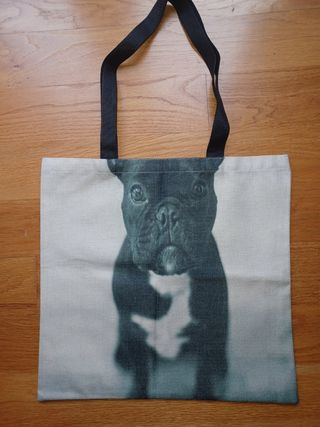 Bolso de lona con la foto de un cachorro de bulldog en ambas caras y fondo beige a estrenar. Tamaño (38×39)cm y desde las asas 64cm.Se puede enseñar sin ningún compromiso