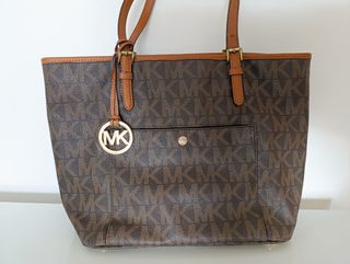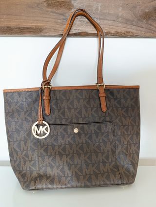 Bolso tote de Michael Kors con un diseño elegante y espacioso. - Material exterior de lona. - Ribetes y asas de piel. - Detalle de charm con logo MK.
