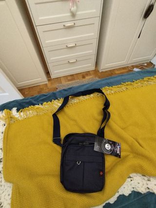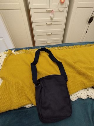 Bandolera de lona sin estrenar. Con bolsillos. Muy práctica. Con dos bolsillos exteriores y cierre de cremallera. Azul marino.