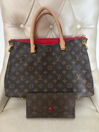 Elegante bolso Louis Vuitton modelo Pallas. - Diseño icónico en lona Monogram. - Forro interior en vibrante color rojo. - Asas y detalles en piel natural. - Incluye monedero a juego.