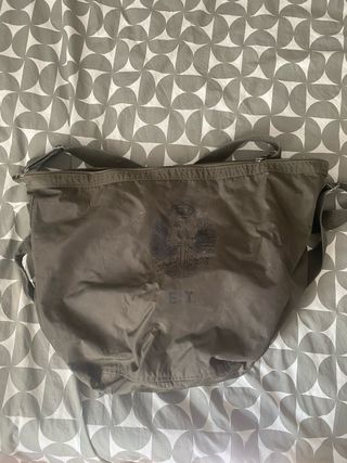 Bolsa de lona militar en color verde oliva. Es espaciosa y resistente. - Asa larga para llevarla al hombro. - Cierre de cremallera. - Bolsillo exterior con cierre de velcro. - Ideal para viajes o actividades al aire libre.