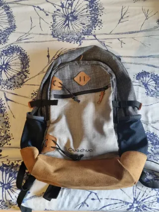 Mochila de montaña Quechua con varios compartimentos y bolsillos. - Diseño en color beige y azul. - Correas ajustables para mayor comodidad. - Cierre principal con cordón y solapa.
