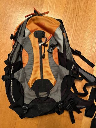 Mochila de montaña. - Color gris y amarillo. - Compartimento principal amplio. - Correas acolchadas y ajustables. - Cinturón lumbar para mayor comodidad. - Ajustable según tamaño de la S a la XL Compartimentos externos: 1 bolsillos superior 2 bolsillos laterales + 2 bolsillos de rejilla, abiertos 2 bolsillos inferiores: uno paea calzado y otro para el impermeable el cual va ligado a la mochila con una cinta elastica 1 bolsillo al cinturón Compartimentos internos: Espacio de gran capacidad de almacenaje Bolsillo abierto a la espalda Mantiene sus broches, correas, tirantes y cremalleras. Con desgastes de tonificación por su us