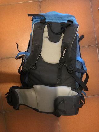 Mochila de montaña y trekking de la marca Quechua. Ideal para ir de campamentos. - Color gris con detalles en azul. - Compartimento principal amplio. - Bolsillos exteriores para acceso rápido. - Correas ajustables para mayor comodidad.
