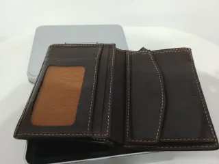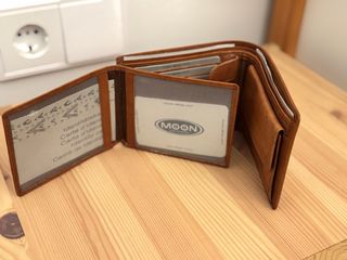 Cartera de piel de la marca Moon. - Diseño plegable. - Múltiples compartimentos para tarjetas y documentos. - Nueva a estrenar