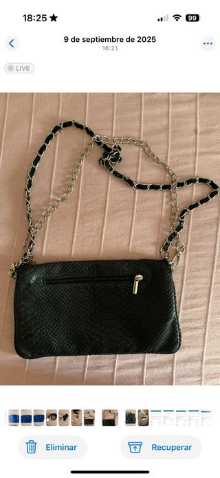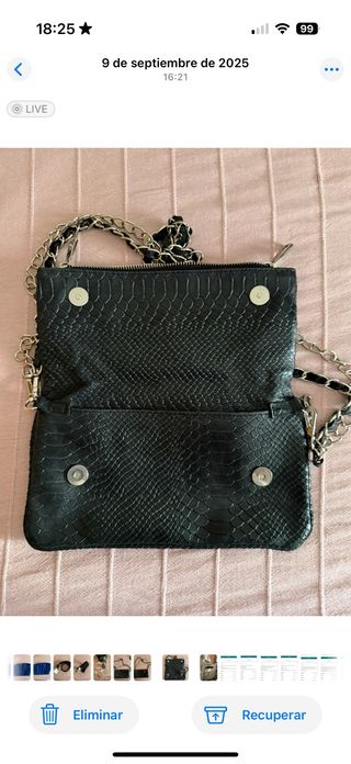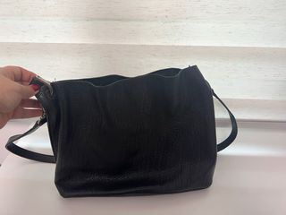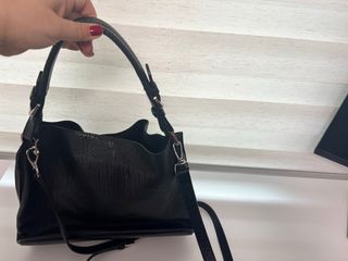 Bolso con solapa con efecto de piel de serpiente de color negro. Cuenta con dos asas, una mas larga y otra mas corta. Tiene cierre de cremallera, dos broches magneticos internos y tres bolsillos. Precio negocible. Cualquier duda escridibme al chat sin problema.