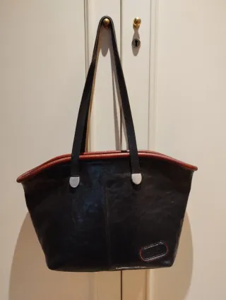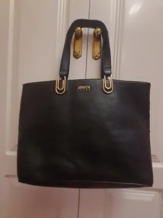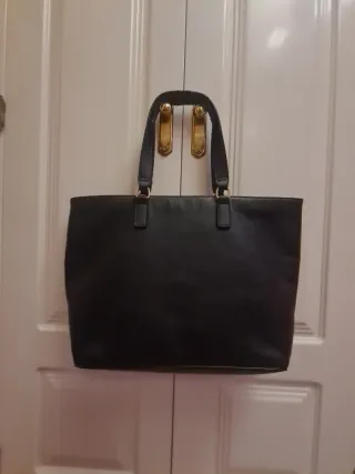 Elegante bolso de piel en color negro. - Diseño clásico y versátil. - Asas cómodas para llevar al hombro o en la mano. - Detalle metálico dorado en las asas. Medidas: 45 cm ancho × 30 de alto Preferiblemente venta en mano, pero tambien pueden hacerse envíos