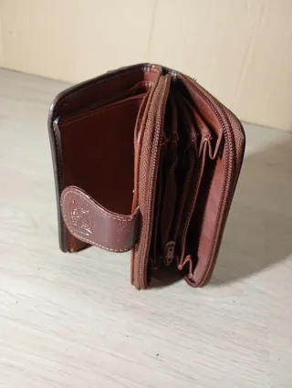 Monedero de piel en tono marrón, con cierre de botón a presión. - Diseño clásico y elegante. - Compartimentos interiores para organizar tus tarjetas y billetes.