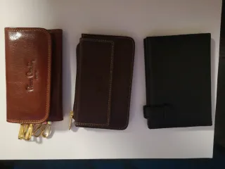 Conjunto de accesorios de piel. - Llavero con varios ganchos de Pierre Cardin. - Billetera de negra de piel - Monedero marron con cierre de piel.