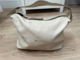 Bolso de piel de la marca Mercules en color beige con detalles dorados. Un accesorio elegante y versátil. - Material: Piel. - Color: Beige y dorado. - Diseño con un pequeño grabado de flecha.