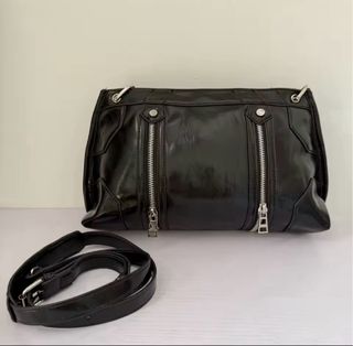 Bolso de piel en color negro, con un diseño moderno y práctico. - Compartimento principal con cierre de cremallera. - Bolsillos exteriores frontales con cremalleras y detalles metálicos. - Asa ajustable para llevar al hombro.