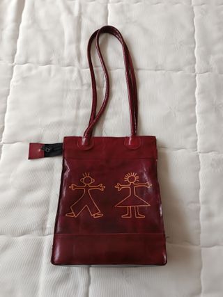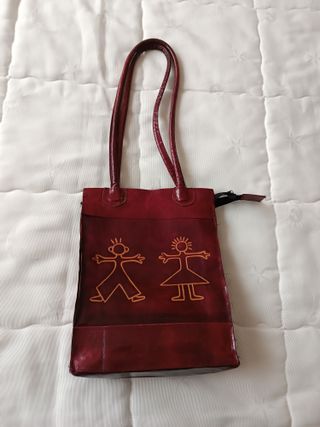 Bolso de piel en color granate con un diseño original. Tiene dos asas largas que valen para mano y hombro. - Material: Piel. - Color: Granate. - Diseño: Figuras de niño y niña. - Interior forrado, cierre con cremallera, tiene un bolsillo interior con cremallera. -Piel suave. -Medidas: 25x20 cm sin contar con las asas. fondo 6,5 cm. -Está un poco descosido en uno de los bordes de la parte superior (se ve claramente en las últimas fotos) y la cremallera a veces no cierra bien, por lo demás está muy bien conservado.