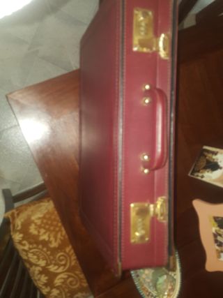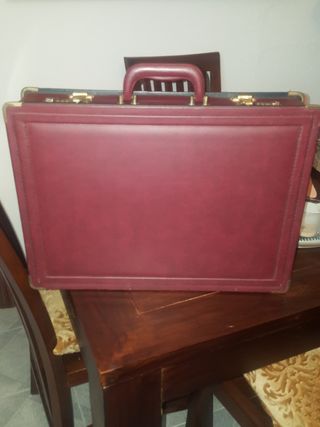 Maletín piel sintética color marrón. En muy buen estado el interrior y el exterior. Aunque presenta pequeños Desperfectos en los bordes y desperfectos de estética en los cierres, que pueden verse en las fotos.Funcionan a la perfección. Medidas ancho 50cms alto 35cms