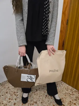 Bolso de mano y bandolera medidas 33 centímetros, 14 centímetros y 22 centímetros inspirado en Polène, nuevo y sin usar. Incluye su bolsa guardapolvo y neceser. El precio no es negociable Se puede usar de mano o con las asas largas al hombro - Bolso de piel. - Color marrón. - Costuras blancas. - Incluye neceser/monedero a juego. - Bolsa guarda polvo.