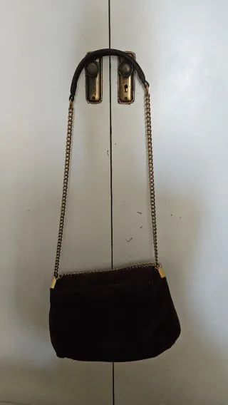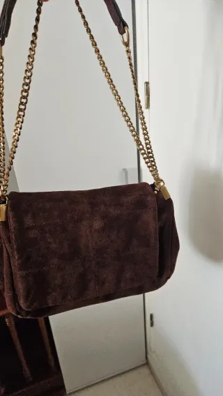 Bolso de piel serraje en color marrón. Un accesorio elegante y versátil. - Material: Piel serraje. - Cadena dorada. - Cierre de solapa.