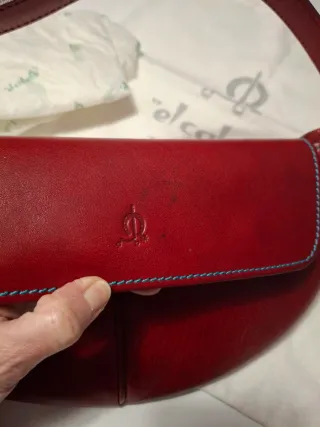 Bolso de mano de la marca El Caballo en color rojo. Un accesorio elegante y práctico. REGALO IDEAL PARA SAN VALENTIN - Piel de alta calidad. - Diseño curvo y compacto. - Costuras en contraste azul. Leves signos de uso, pequeñas manchitas, pero ningún desgaste, dado su poco uso. El forro interior perfecto