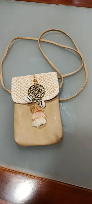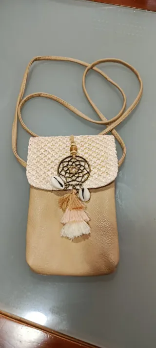 Bolso pequeño para móvil con un diseño único y detalles bohemios. - Acabado en piel sintética. - Parte superior tejida. - Adornado con un atrapasueños, conchas y flecos. - Correa larga para llevar cruzado o al hombro.