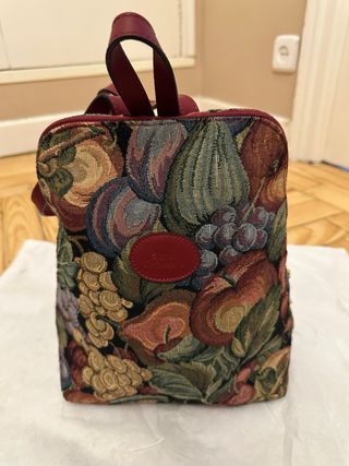 Mochila con un bonito estampado de frutas en tapiz y detalles en piel. - Diseño de tapiz con motivos frutales. - Ribetes y asas en piel color rojo.