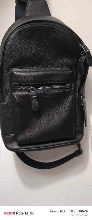 Mochila tipo bandolera de la marca Coach. - Elaborada en piel. - Color negro. - Compartimento principal con cierre de cremallera. - Bolsillo frontal con cremallera.