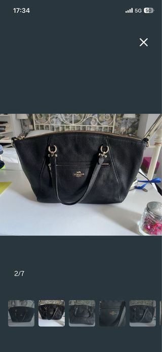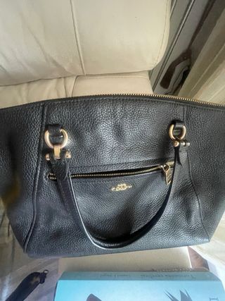 Elegante bolso de la marca Coach, confeccionado en piel con una textura distintiva. - Cierre principal con cremallera. - Bolsillo exterior con cremallera. - Detalle de logo metálico dorado. - Asas de mano cómodas.