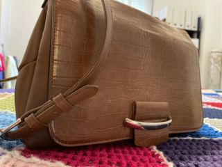 Bolso de material sintético con un bonito efecto piel. - Cierre con solapa y detalle metálico. - Correa ajustable. - Diseño elegante y versátil.