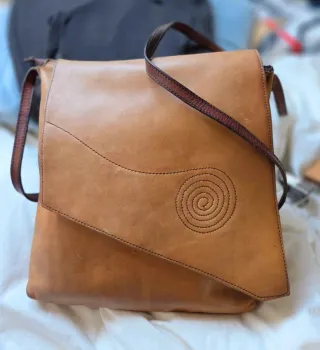 Bolso vintage de piel en tono camel con un diseño único. - Solapa asimétrica. - Detalle de espiral cosido en la parte delantera. - Correa de hombro ajustable.