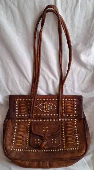 Bolso pequeño de piel con un diseño grabado. - Hecho en Marruecos. - Cierre de cremallera superior. - Correa ajustable para llevar al hombro.