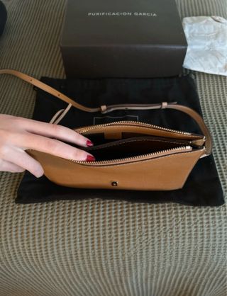 Bolso original de Purificación García en piel. - Diseño con monograma grabado. - Pequeño logo metálico en la parte frontal. - Incluye bolsa guardapolvo con logo PG.