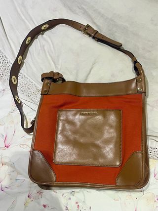 Bolso de mano Michael Kors en color naranja y piel. - Diseño vintage. - Combinación de materiales. - Correa ajustable.