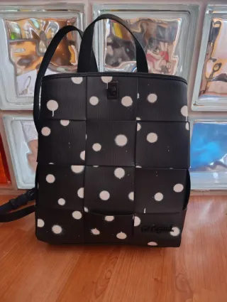 Mochila Desigual con un diseño de lunares. - Cierre de clip en la parte superior. -Mochila pequeña trenzada en tejido efecto piel con textura y estampado de gotas. -Varios compartimentos y bolsillos. -Estampado de gotas estilo spray -Bolsillos interiores -Cierre metálico -Tres compartimentos -Varias asas -Tejido efecto piel con textura de canvas -24,4 x 8,6 x 29,3 cm