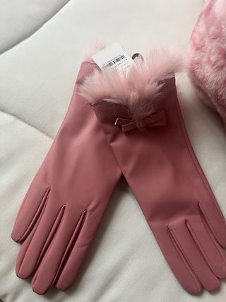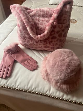 Bolso de pelo rosa con estampado, gorro y guantes