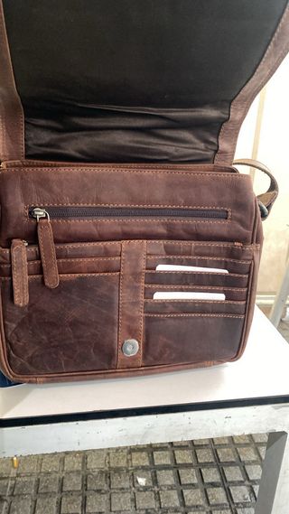 Bolso bandolera de piel auténtica, suave y cuidada. - Material: Piel genuina. - Diseño con solapa y bolsillos frontales y bolsillos interiores.