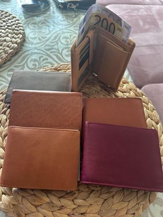 Conjunto de artículos de piel de búfalo, ideal para un regalo especial. - Cartera marrón. - Cartera roja. - Neceser marrón. - Llavero con detalle de piel. - Pequeño monedero verde. - Tarjetero negro.