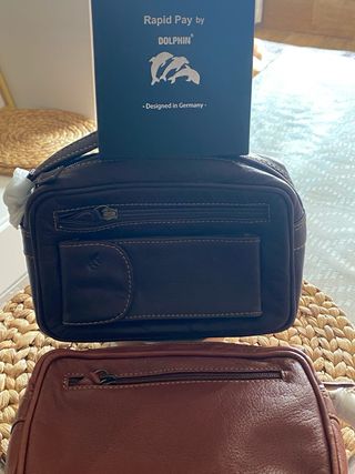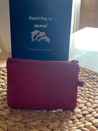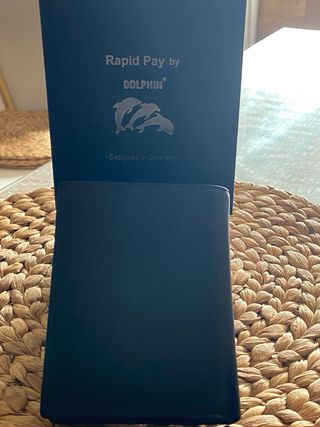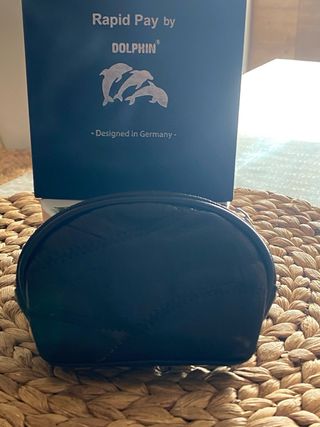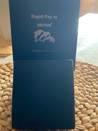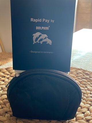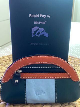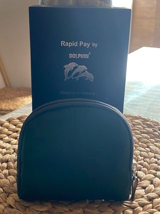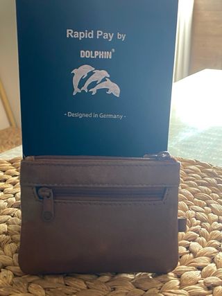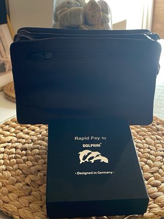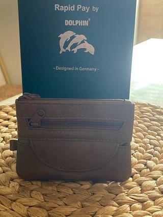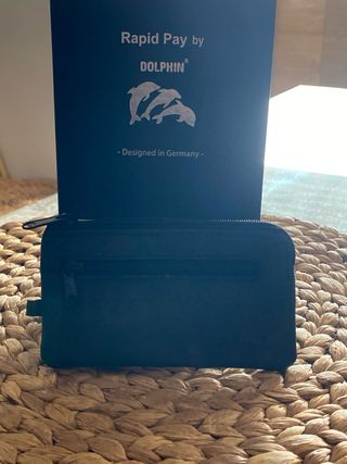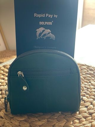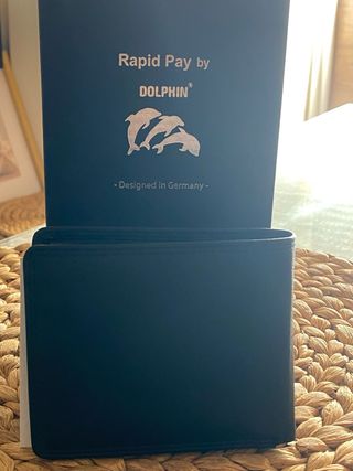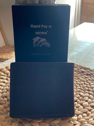 Elegante cartera de piel de búfalo. - Material: Piel de búfalo. - Color: Negro. - Diseño: Rapid Pay by Dolphin con logo de delfines. - Fabricado en Alemania.