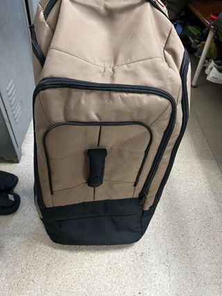 Maleta de gran capacidad con diseño robusto con ruedas, ideal para viajes o equipamiento. - Color principal beige con detalles en negro. - Asa superior de transporte reforzada. - Compartimento inferior con cremallera. Tiene unos rasguños en la parte posterior al lado de las ruedas.