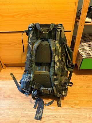 Mochila de estilo militar con estampado de camuflaje. tiene varios usos pero esta en un muy buen estado. es original del ejercito. - Diseño con múltiples compartimentos y bolsillos. - Correas ajustables para mayor comodidad. - Tejido resistente. - Funda impermeable