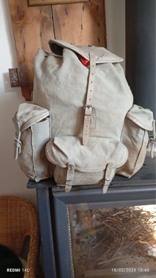 Esta mochila de montaña en comparación con las mochilas modernas, puede parecer un poco arcaica, pero bueno, es un material retro genuino hecho a mano por maestros artesanos, con una tirada militar. Es muy parecida a las que utilizaban las tropas de montaña del batallón alpino del ejercito español en la guerra civil de la posguerra. Medidas 38x20x40cmAl Ideal para coleccionistas, nostálgicos y aficionados a las antigüedades en general. También se puede utilizar como elemento ornamental y decorativo.