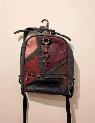 Mochila Desigual con un diseño patchwork único. - Combinación de parches en diferentes tonos. - Cierre de cremallera frontal. - Colgante decorativo con símbolo.