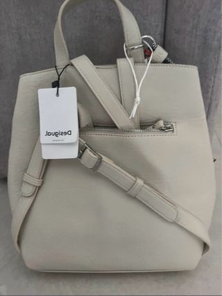 Mochila de la marca Desigual con un diseño floral en relieve. - Color blanco roto - Cierre de solapa con broche metálico. - Asa superior y correas ajustables. - Interior espacioso. Bolsillo posterior y varios departamentos Nueva sin estrenar con etiquetas