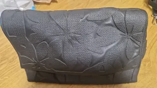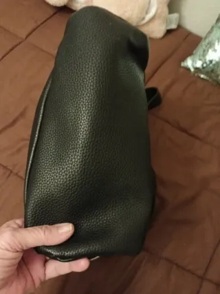 Bolso negro con un diseño texturizado y un mandala central. Donde hace el doblez está algo pelado. - Material: Piel sintética. - Cierre: Cremallera. - Asa: Tres tipos de asa. - Interior: Compartimentos. - Exterior: Diseño acolchado y mandala grabado.