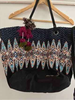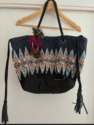 Bolso de la marca Desigual nuevo con etiquetas - Combinación de colores azul y multicolor. - Adornado con pompones y flecos. - Estampado geométrico distintivo.